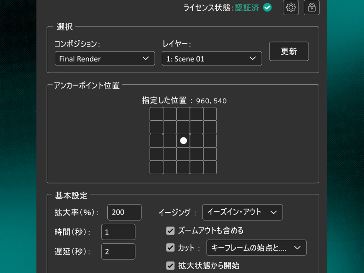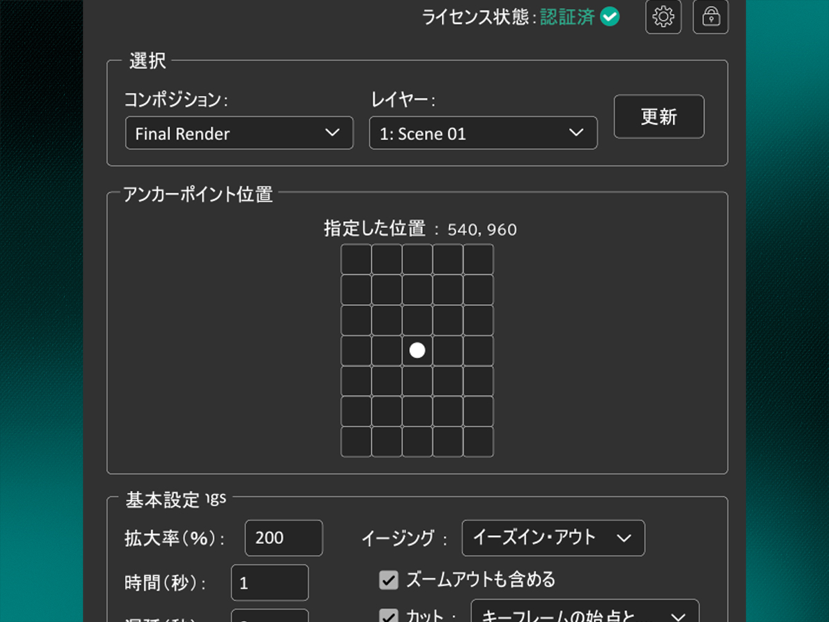 ズーム適用後でもズームポイントを自由に調整できる、革新的なポイントコントロール機能を搭載。「もう少し右に...」「少し上にずらしたい...」といった微調整が、エフェクトパネルからリアルタイムで実行可能です。エクスプレッションを活用した位置連動機能により、アンカーポイントの位置を変更しても、ズームエフェクト全体が整合性を保ったまま動作します。キーフレームを一つひとつ手動で調整する煩わしさから解放され、クリエイティブな意思決定に集中できます。完璧なズームポイントを見つけるまで、何度でも調整可能です。